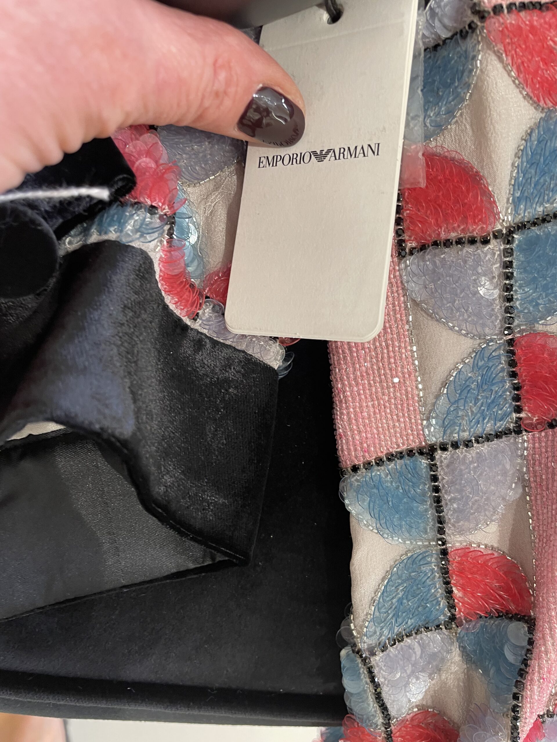 Dettagli: Taglia 44 IT · Made in Italy · Codice stile H3NG46 · Agosto 2022 · Nuova con cartellino · Include sacchettino con paillettes e perline di ricambio.