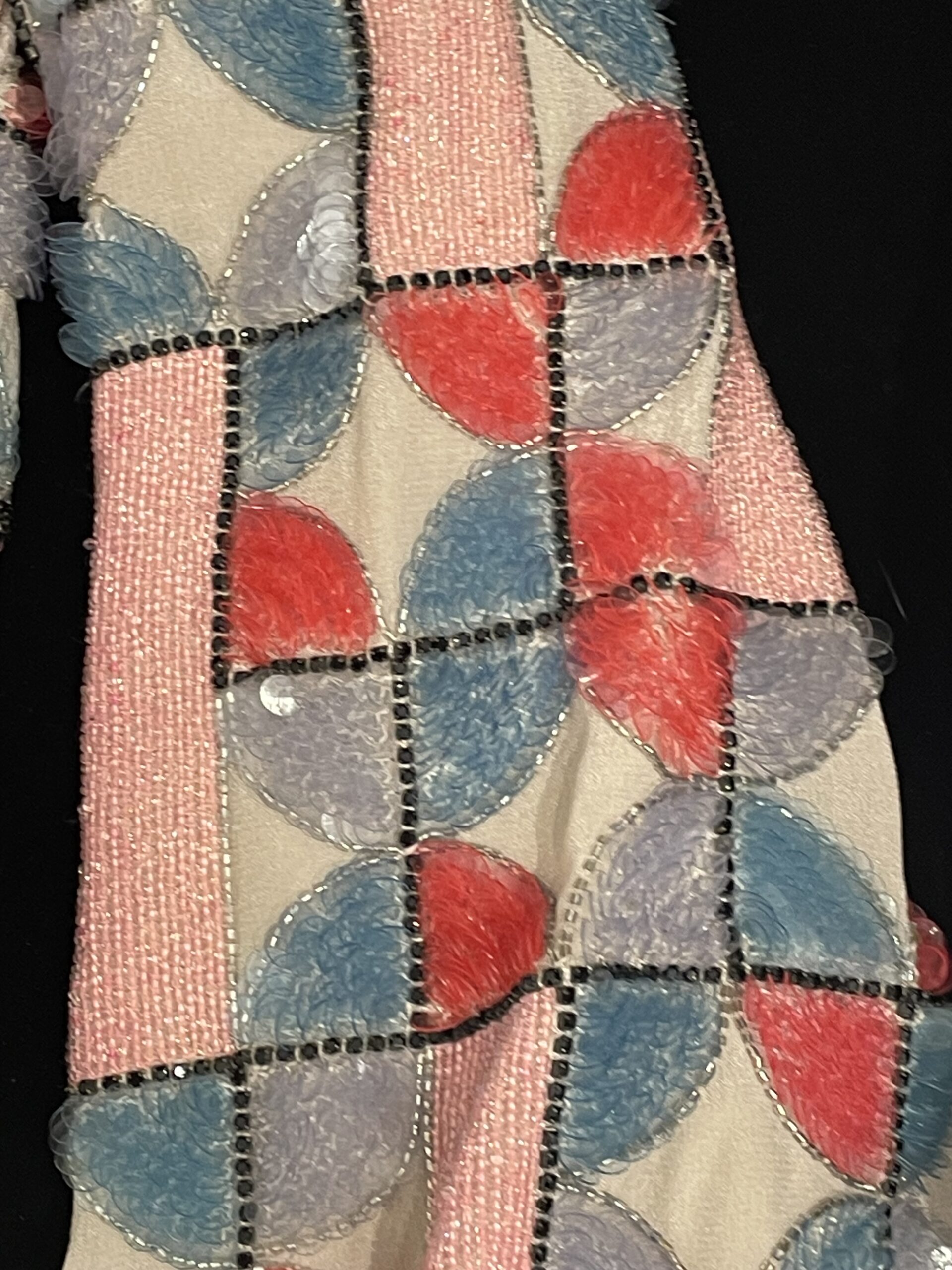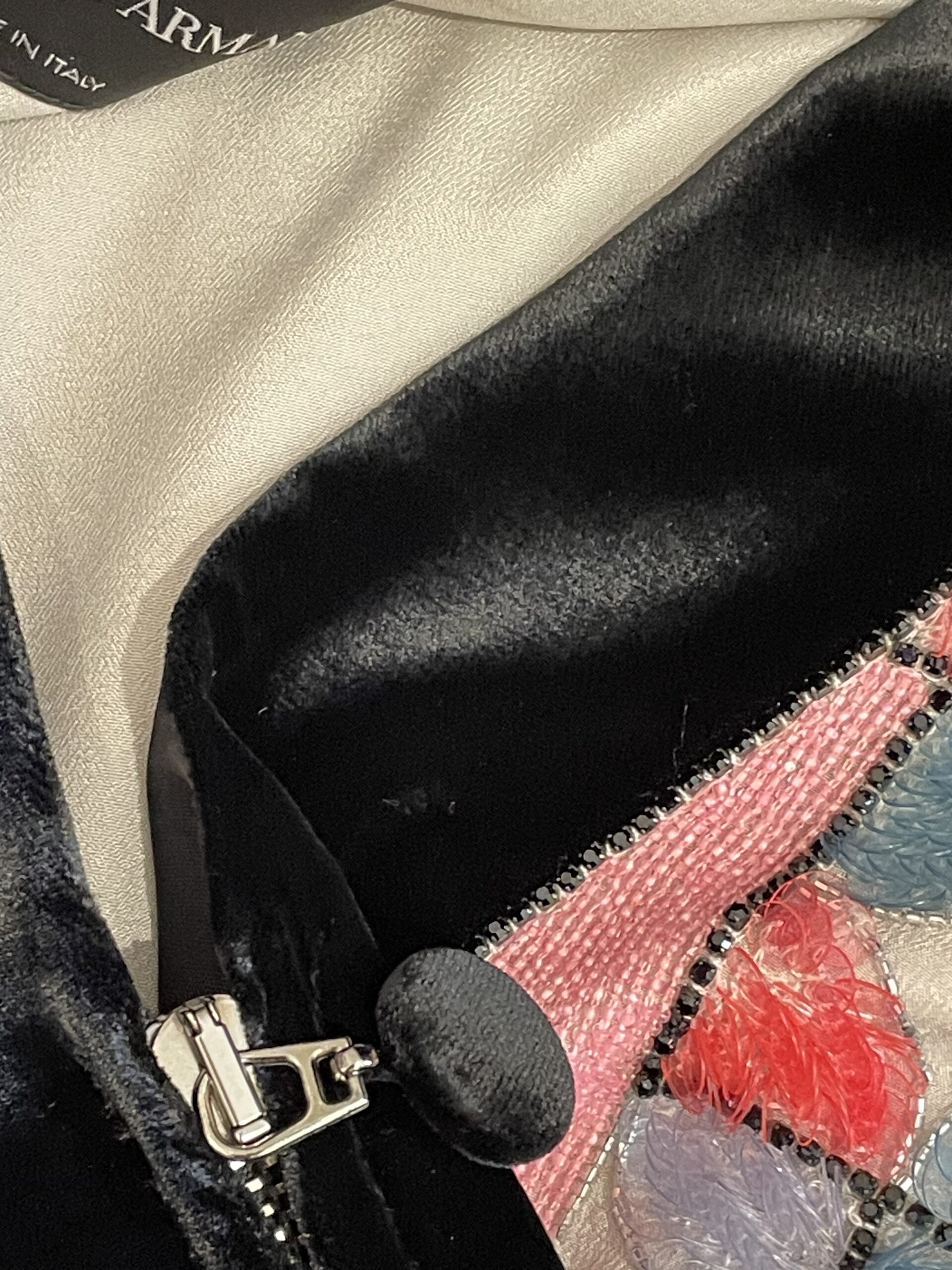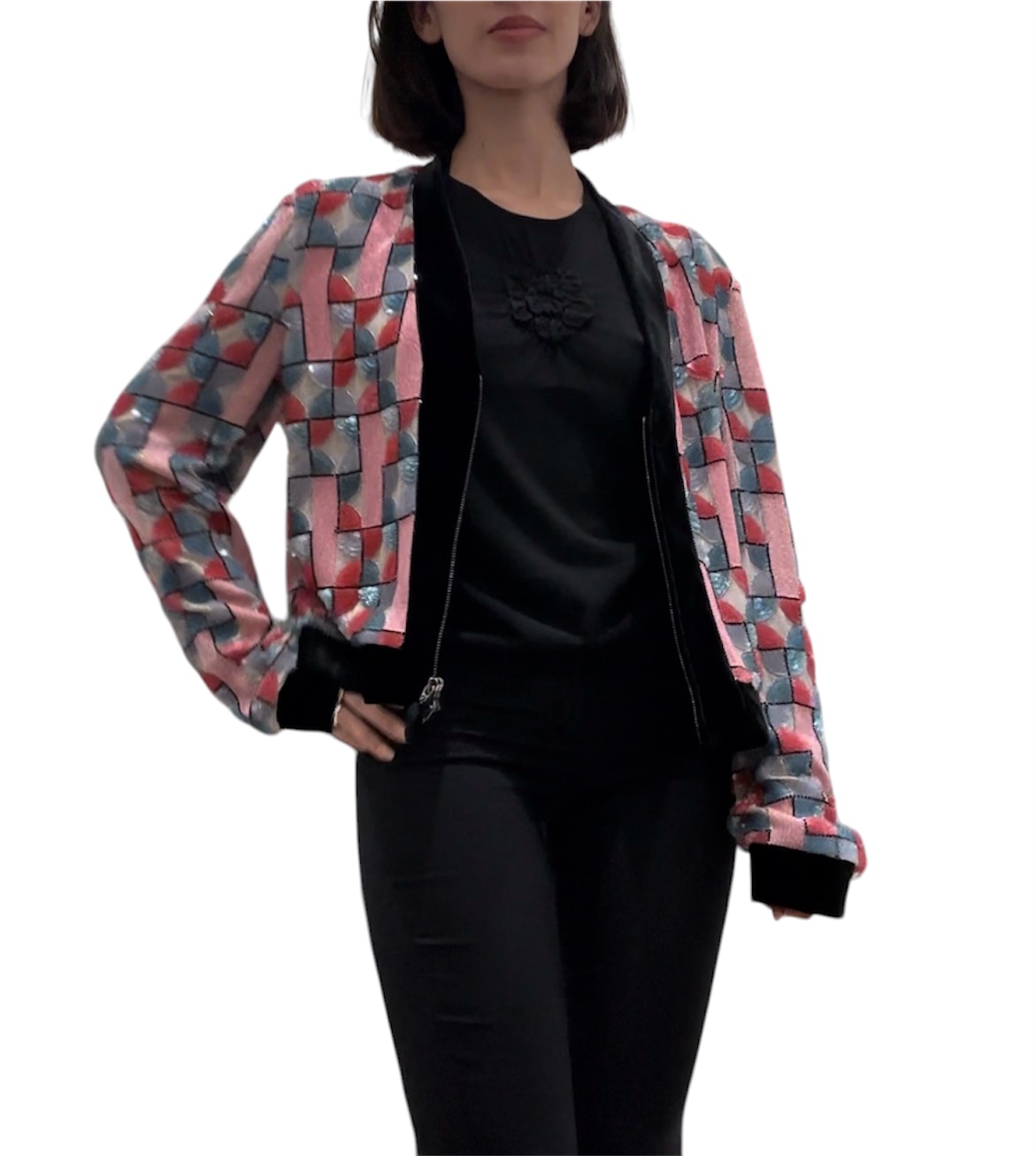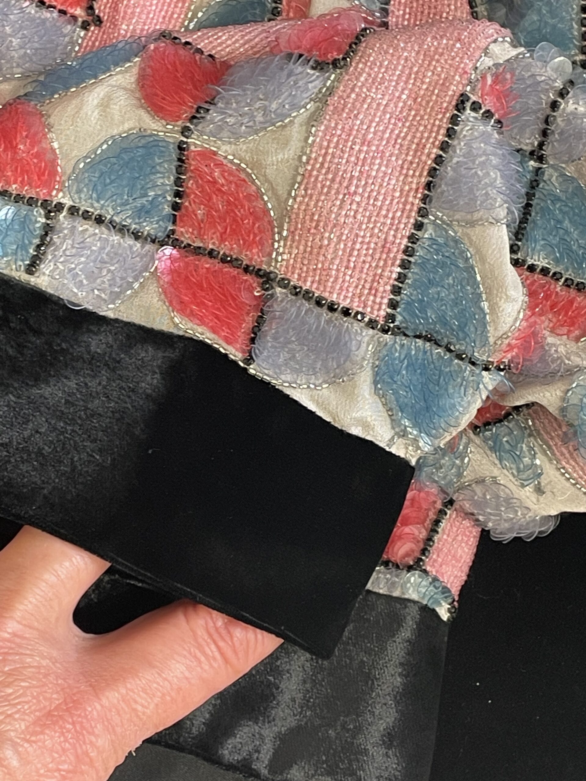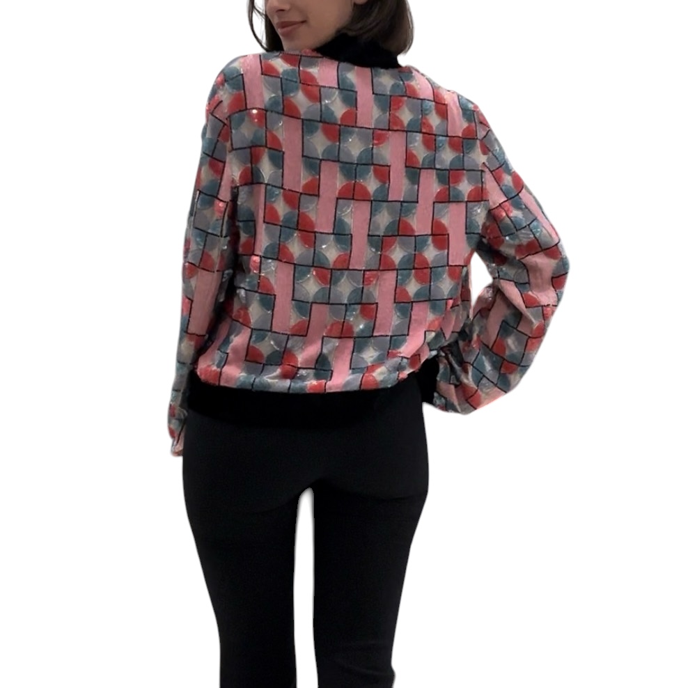 Una giacca straordinaria della collezione Emporio Armani 2022, realizzata interamente a mano in Italia. Il corpo è decorato con un ricco ricamo a mosaico geometrico composto da paillettes, perline seed, perline bugle e nastri intrecciati nei toni del rosa, rosso, blu ardesia e lavanda su base trasparente. Le linee della griglia sono definite da micro-cristalli neri, creando un effetto vetrata. Rifinita con pregiato velluto nero al colletto, ai polsini e all’orlo, chiusura con zip argentata e fodera in raso color champagne.