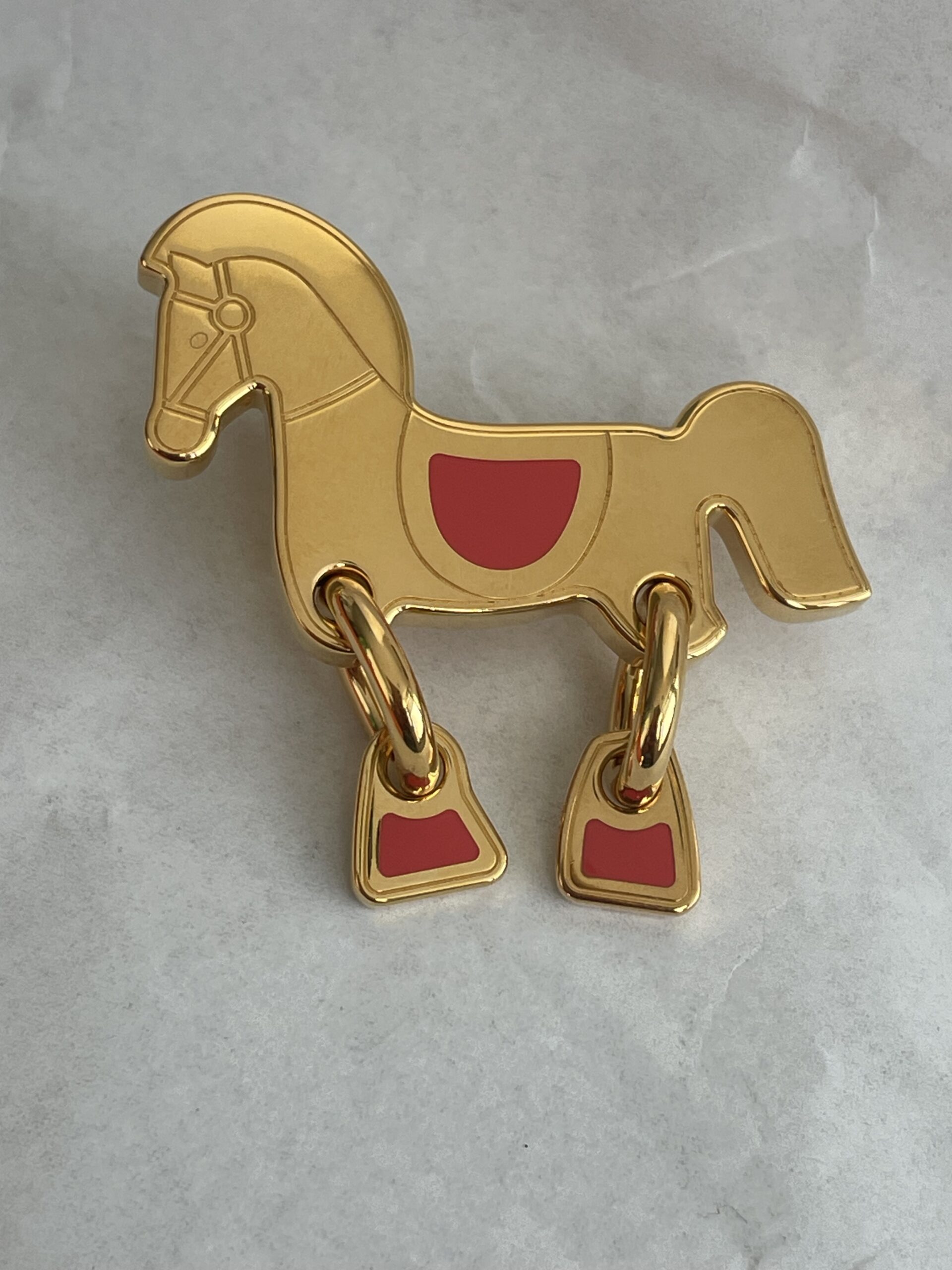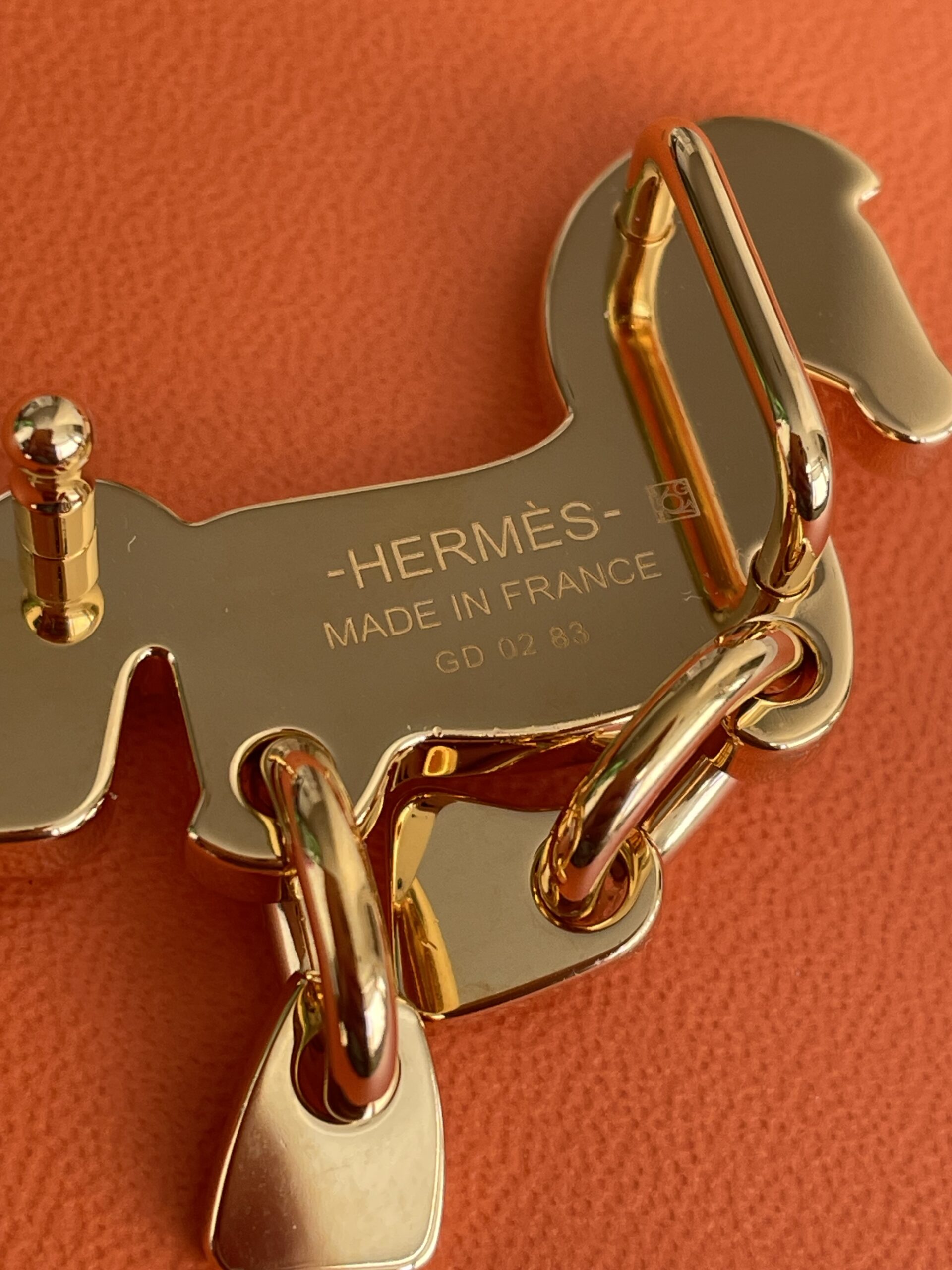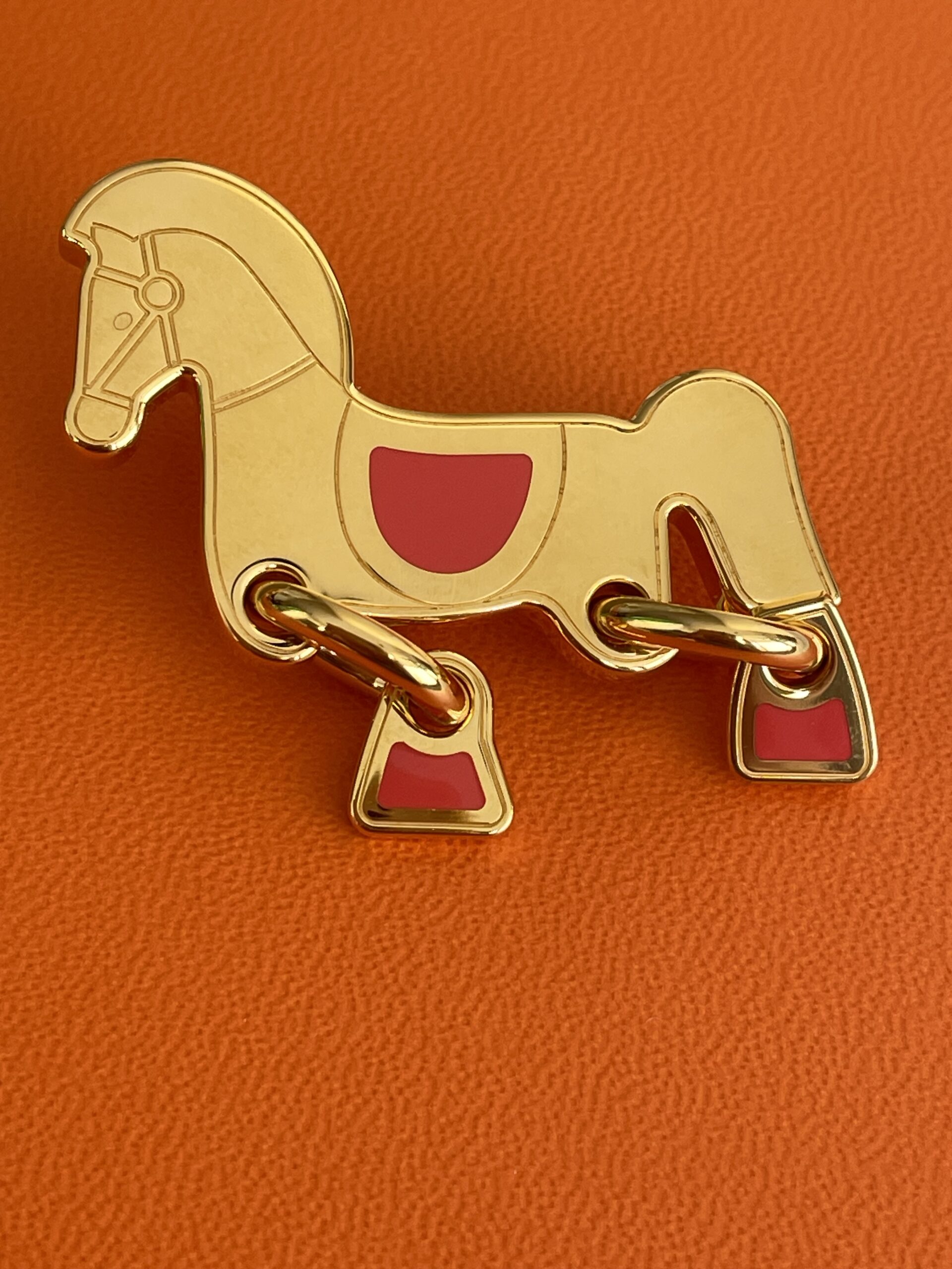 - Materiali fibbia: metallo placcato oro, inserti smaltati rossi.