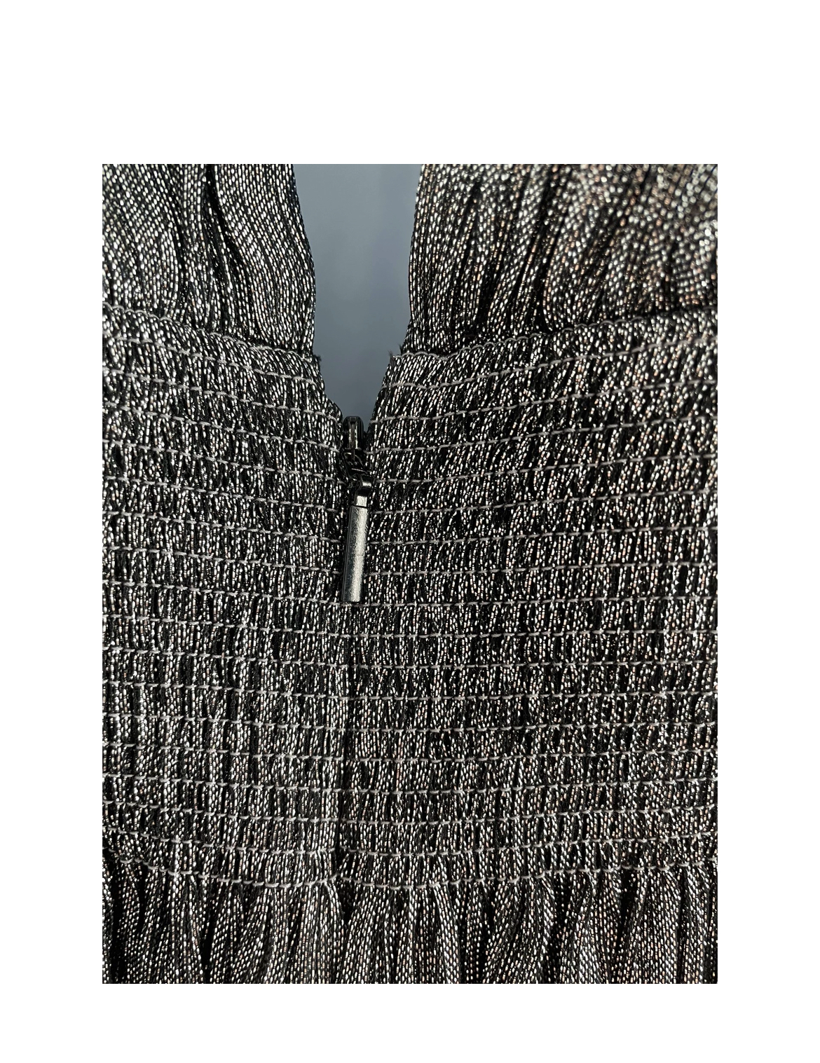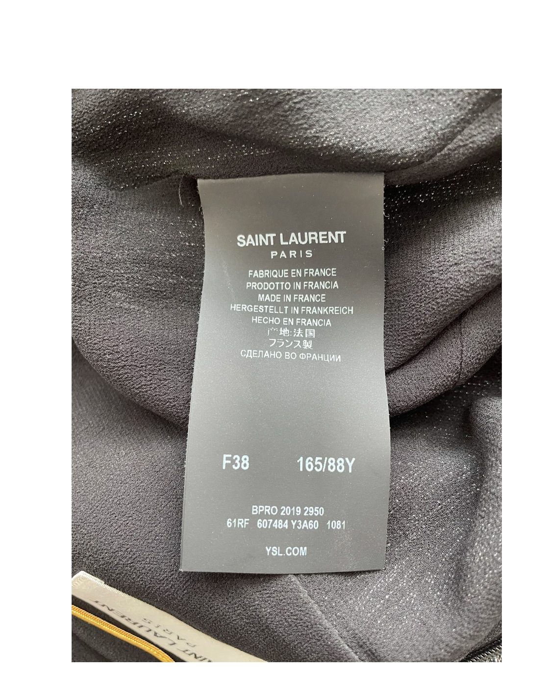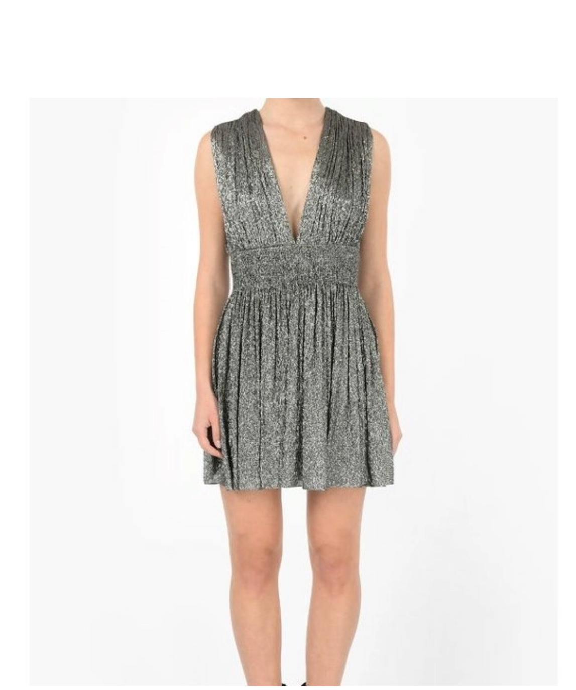 Saint Laurent mini abito da cocktail senza maniche in jersey di seta argento metallizzato (con il 22% di fibra metallizzata). Presenta una silhouette con scollo a V e schiena scollata, una cintura smocked e una minigonna a balze. Si apre con una cerniera nascosta sul retro ed è foderata in seta (100%). È in ottime condizioni. Collezione Resort 2020. Taglia Fr 38. Misure: Busto 72cm (28.1in) Vita 70cm (27.3in) Fianchi 120cm (46.8in) Lunghezza 81 cm (31,6 pollici) Lunghezza cuciture laterali 49cm (19.1in).