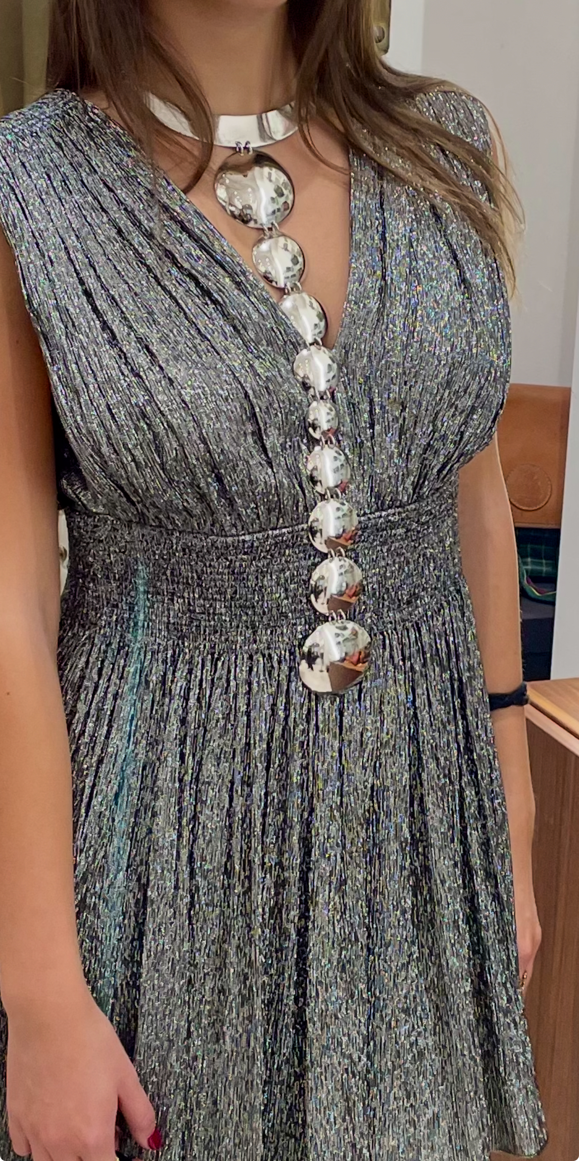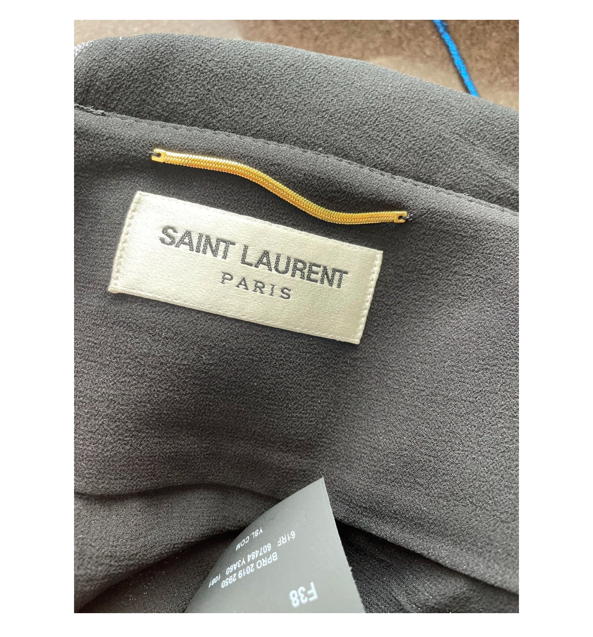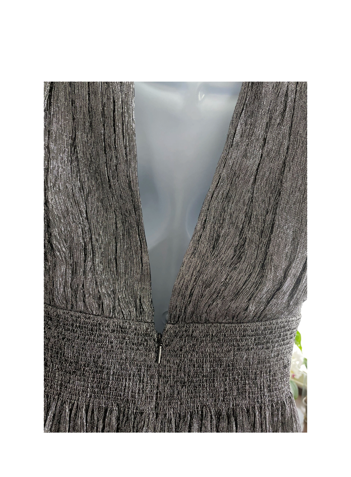 Saint Laurent mini abito da cocktail senza maniche in jersey di seta argento metallizzato (con il 22% di fibra metallizzata). Presenta una silhouette con scollo a V e schiena scollata, una cintura smocked e una minigonna a balze. Si apre con una cerniera nascosta sul retro ed è foderata in seta (100%). È in ottime condizioni. Collezione Resort 2020. Taglia Fr 38. Misure: Busto 72cm (28.1in) Vita 70cm (27.3in) Fianchi 120cm (46.8in) Lunghezza 81 cm (31,6 pollici) Lunghezza cuciture laterali 49cm (19.1in).