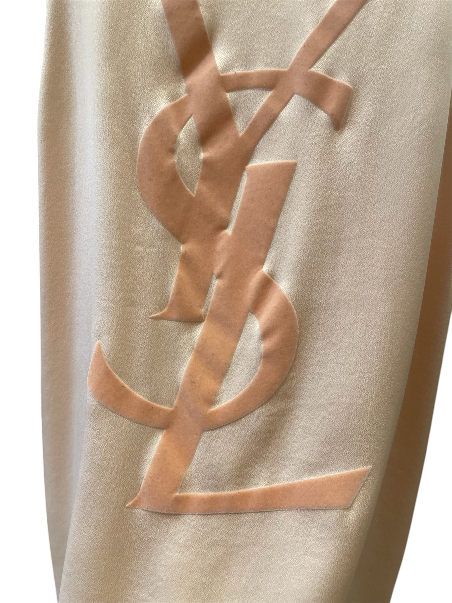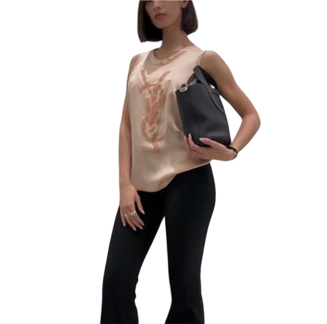 Un pezzo vintage raro e da collezione della storica linea Yves Saint Laurent Rive Gauche. Realizzato in Italia in pura seta, questo top senza maniche presenta l’iconico monogramma YSL stampato in tono su tono in un delicato rosa cipria, con un effetto trompe-l’œil sofisticato e senza tempo. Il tessuto in seta fluida con finish satinato offre una caduta elegante e un lusso silenzioso tipico della grande maison francese. Scollo rotondo, spalle ampie, silhouette morbida e leggermente over.