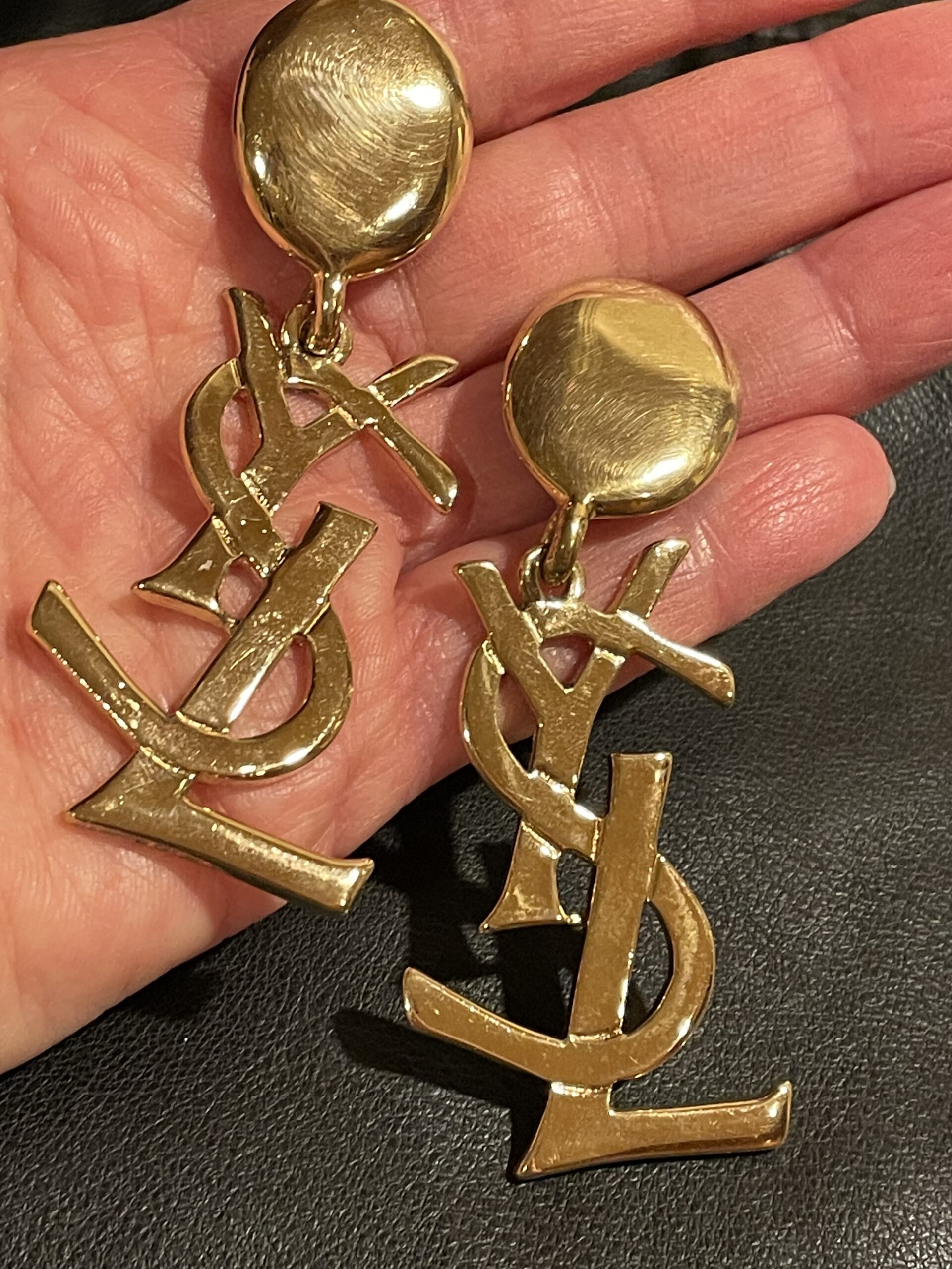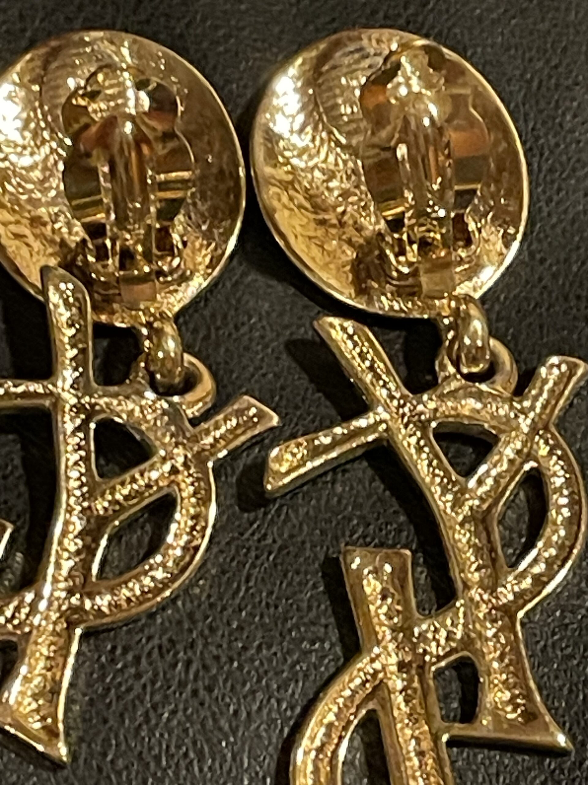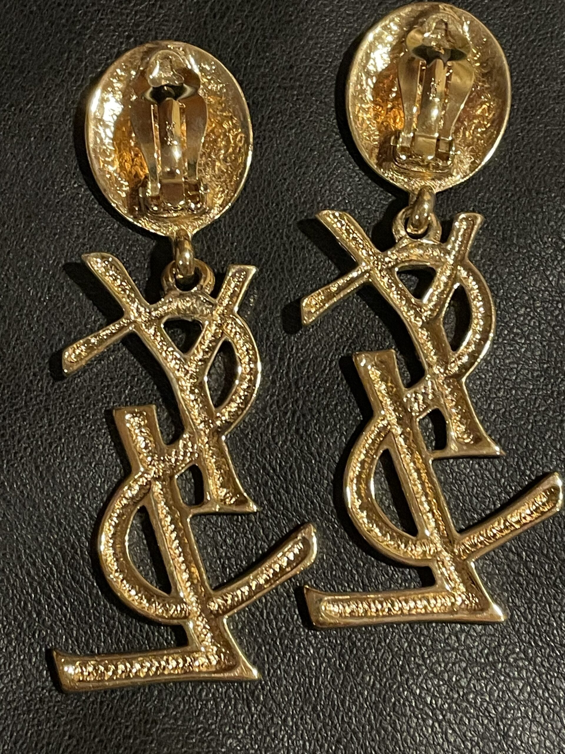 Vintage Yves Saint Laurent Orecchini Logo Oversize placcati in oro. Firmato sul retro. Iconici e rari, questi orecchini sono stati visti indossati da Kim Jones (Sex and the City). Misure: Altezza: 3,34 pollici (8,5 cm) Larghezza: 1,37 pollici (3,5 cm) Peso per orecchino: 17 grammi. Gli orecchini sono in ottime condizioni; i minimi graffi, mostrati nelle immagini, sono poco visibili.